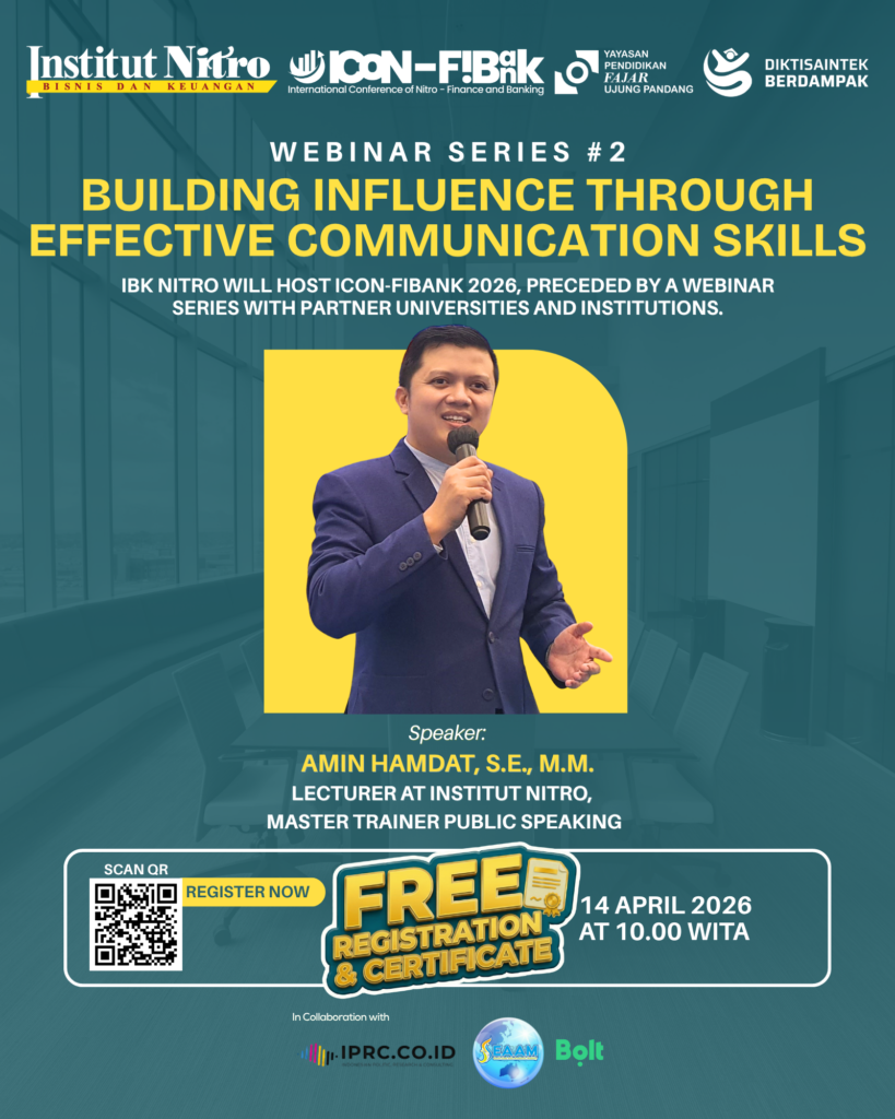 Institut Bisnis dan Keuangan Nitro (IBK Nitro) bersama mitra perguruan tinggi dan institusi kolaboratif resmi menyelenggarakan Webinar Series #2 sebagai bagian dari rangkaian Road to ICon-FiBank 2026. Pada sesi kedua ini, webinar mengangkat topik utama “Building Influence Through Effective Communication Skills” yang bertujuan untuk membedah strategi dan keterampilan komunikasi dalam membangun pengaruh di dunia profesional.