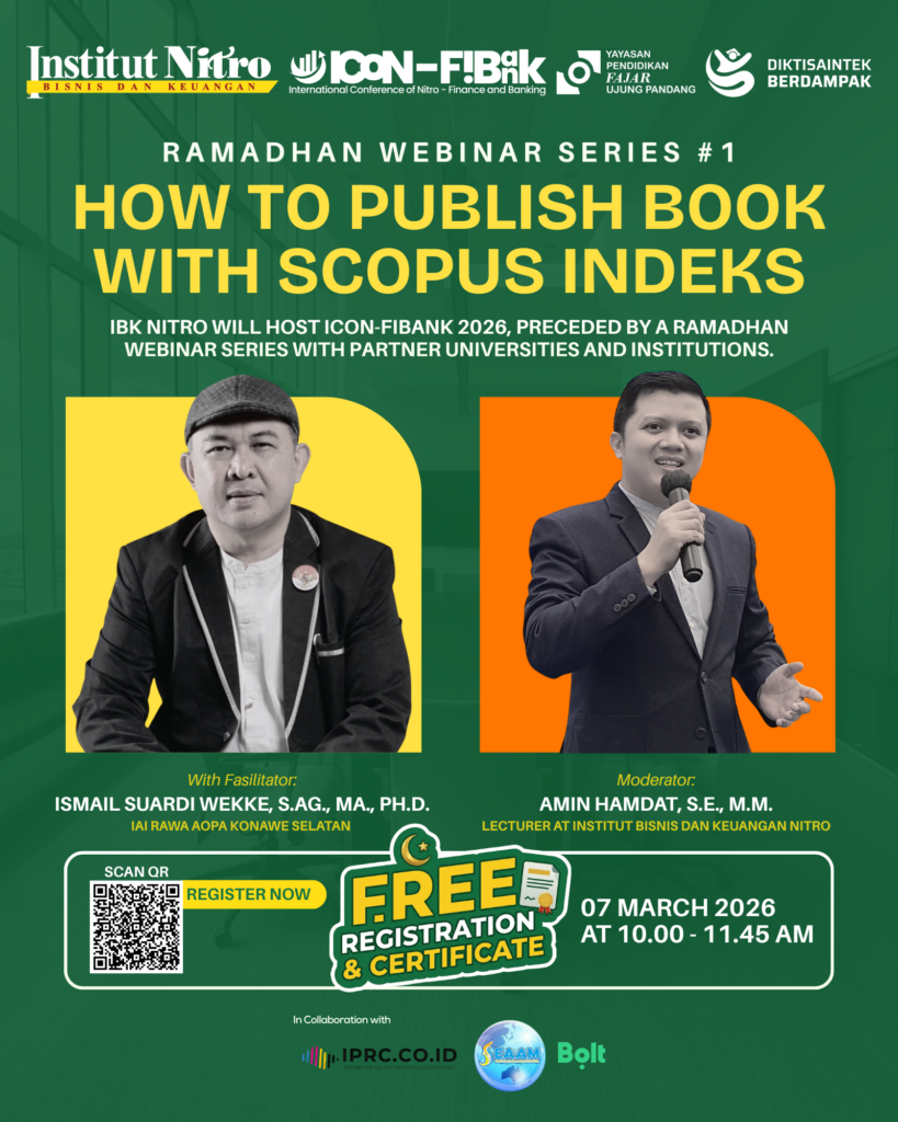 Mengisi bulan suci dengan produktivitas akademik, Institut Bisnis dan Keuangan (IBK) NITRO bersama mitra perguruan tinggi dan institusi kolaboratif resmi memulai rangkaian Road to ICon-FiBank 2026 melalui gelaran Ramadhan Webinar Series #1. Pada seri perdana ini, webinar mengangkat topik yang sangat dinantikan oleh kalangan akademisi, yaitu “How to Publish Book with Scopus Index”.